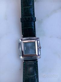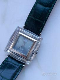 orologio donna swarovski vintage, vetro minerale temperato, quadrato, perfettamente funzionante, movimento analogico al quarzo, ghiera in cristallo, il cinturino in pelle verde presenta segni di usura dovuti all'utilizzo