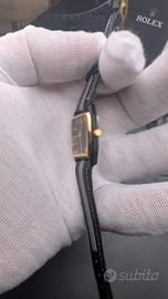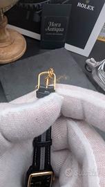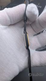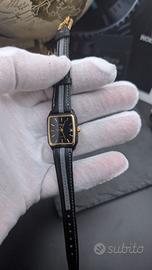 Cinturino in pelle nera con inserto centrale grigio, molto raffinato e comodo al polso. Presente datario a ore 3, dettaglio pratico che completa il design classico.