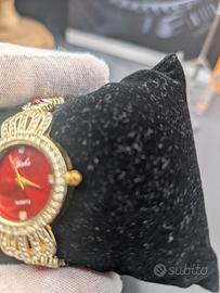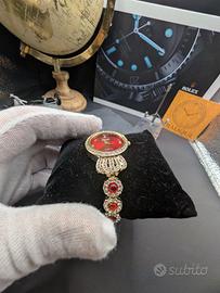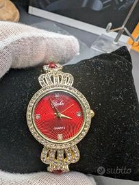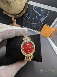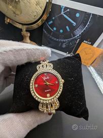 Orologio da donna Viale, stile elegante / gioiello, con cassa dorata impreziosita da pietre e quadrante rosso decorato con indici brillanti.