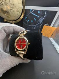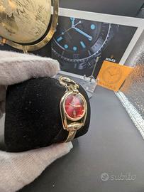 Orologio da donna Vian, stile elegante vintage, con cassa e bracciale dorati e quadrante rosso intenso con numeri romani.