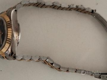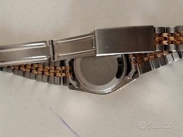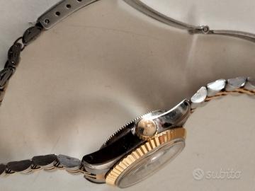 Orologio Donna Vintage Style "President" - Bicolore Quadrante Blu - DA RIPARARE / RICAMBI Specifiche dell'oggetto Marca:vintage Stile:Classico / Elegante (Tipo Datejust) Movimento:Quarzo (Giapponese) Colore Quadrante:Blu Soleil Materiale:Acciaio Inossidabile Bicolore (Argento/Oro) Caratteristiche:Lunetta zigrinata, datario con lente ciclope, cinturino stile Jubilee. Descrizione Splendido orologio da donna in stile vintage con design iconico bicolore. L'orologio presenta un raffinato quadrante blu con indici dorati e la classica lunetta zigrinata. Il cinturino è il celebre modello bicolore a cinque maglie (stile Jubilee), perfetto per chi cerca un look elegante e senza tempo. CONDIZIONI DELL'OGGETTO: Stato:Non funzionante. Viene venduto esclusivamente come"da riparare"o per"parti di ricambio". Estetica:Buone condizioni generali come da foto. Presenta normali segni di usura dovuti al tempo sulla cassa e sul cinturino. Il vetro è integro. Nota per l'acquirente:Ideale per collezionisti, per chi desidera recuperare componenti originali o come accessorio per shooting fotografici e moda vintage. Vendita con formula "visto e piaciuto". Si prega di osservare attentamente le foto che sono parte integrante della descrizione.