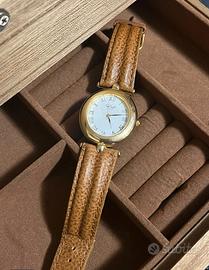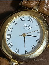 Orologio in acciaio dorato Ken Scott. Movimento al quarzo. Quadrante ovale 30x34 mm. Cinturino in pelle marrone con evidenti segni di usura. Perfettamente funzionante.