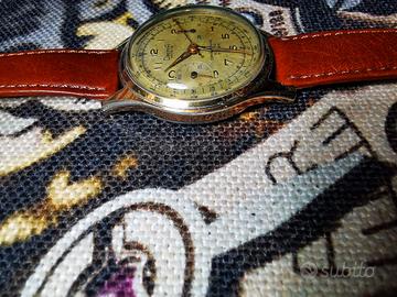 Dalla mia collezione privata propongo questo bellissimo orologio Dreffa Chronographe Suisse anni 50 perfettamente funzionante sia tempo che cronografo. Cassa placcato oro da 37mm( classici segni all'utilizzo) , bellissima patina nel quadrante dovuta alla sua invecchiata, pulsanti a pompa fondello a vite acciaio. Monta un affidabile movimento Landeron 51 a carica manuale. Cinturino in vera pelle nuovo. Vetro plexy ancora in ottimo stato. Ultima revisione sconosciuta, anche se l'orologio funziona perfettamente, consiglio una revisione al movimento. Per qualsiasi info contattatemi.