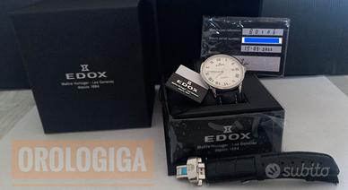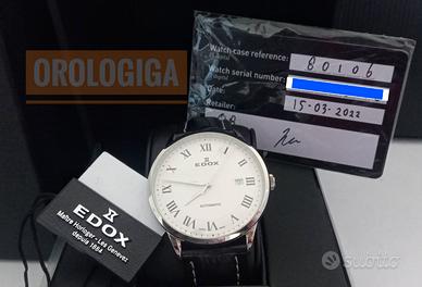 Quadrante bianco, movimento Edox cal. 80, 26 rubini. Dimensioni cassa 41mm, materiale cassa acciaio inox 316L. Vetro zaffiro, cinturino vera pelle con logo edox. Impermeabilità 5 ATM.