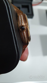 Orologio Emporio Armani Fluid Deco Limited Edition ORIGINALE, edizione limitata a 88 pezzi al mondo. Questo è il n. 2 di 88. Cassa laminata in oro rosa diametro 35mm. Sui fianchi della cassa sono incastonati 82 diamanti. Corona con cabouchon in quarzo nero fume'. Quadrante in madreperla bianco con indici oro a punta di lancia. Datario ad ore 6. Movimento automatico svizzero della STP di Manno, calibro STP 1-11 visibile dal fondo vitre' (vetro trasparente). Impermeabile fino a 30 mt. Bracciale laminato in oro rosa con fibbia deployante completo di tutte le maglie. Circonferenza polso max cm 18,5.