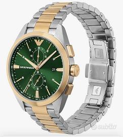 Vendo orologio Emporio Armani, con ottimo abbinamento di colori verde smeraldo/giallo oro/acciaio. Munito di movimento di caricamento automatico con il movimento del polso e anche ad energia solare. Munito di datario e cronografo, è resistente all’acqua. Orologio regalatomi ma mai messo. Scatola, maglie, istruzioni come da negozio.