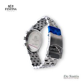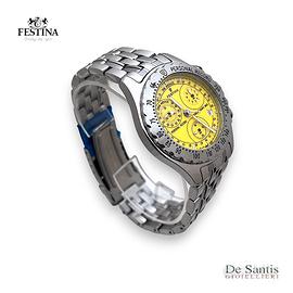 Marca: Festina Genere: Uomo Movimento: Cronografo, al Quarzo Materiale Cassa: Acciaio Inox Forma Cassa: Rotonda Dimensioni Cassa: 40 mm Colore Quadrante: Giallo Dettagli Quadrante: 3 Contatori Cronografo, Indicazione Data a Ore 4 Lunetta: Fissa in Acciaio con Scala/Indicazioni Materiale Cinturino: Acciaio Inox Colore Cinturino: Argento Chiusura: Deployante