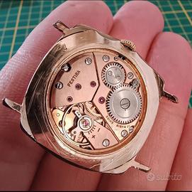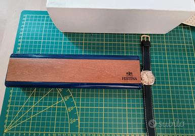 In vendita un elegante orologio vintage Festina degli anni '70, caratterizzato da un design classico "carré" con angoli smussati e una splendida finitura della cassa in tonalità oro rosa. Un pezzo di storia dell'orologeria meccanica svizzera, perfetto per chi cerca uno stile retro raffinato. Caratteristiche principali: • Movimento: Meccanico a carica manuale, 17 Rubis, firmato Festina. Calibro svizzero di alta qualità, visibile nelle foto del movimento. • Quadrante: Color rame con indici applicati a rilievo e numeri arabi ai poli. Lancette a bastone coordinate. • Cassa carrè da 32 mm corona esclusa. fondo in acciaio inossidabile. Sistema antiurto Incabloc. Fondello in acciaio numerato (32122 / 8 67) con logo originale Festina. • Cinturino: In pelle nera con cuciture a contrasto. Nuovo. • Inclusa scatola d’epoca originale Festina.