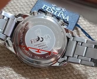 Elegante orologio Festina con cassa e bracciale in acciaio inossidabile. Il quadrante nero presenta dettagli in argento e lancette rosse, con tre cronografi.