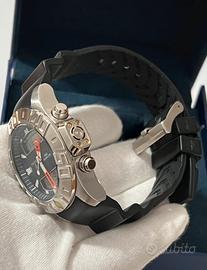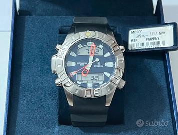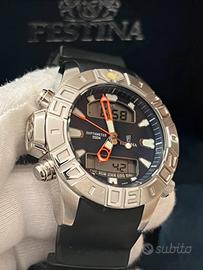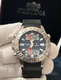 Orologio Festina, NUOVO, profondimetro, impermeabile a 200 metri, analogico e digitale, al quarzo, ghiera in acciaio girevole unidirezionale, cassa in acciaio 316L di diametro 42 millimetri e di spessore 14 mm, quadrante blu scuro con indici luminescenti, fondello in acciaio a vite, cinturino in gomma nero con ansa di larghezza 25 millimetri. L'orologio aperto e comprensivo della cassa misura 25,5 centimetri. Funzionante, con batteria nuova.