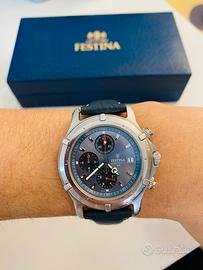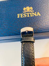 Orologio da polso Festina da uomo con cinturino in pelle blu. - Quadrante blu con dettagli argento. - Cronografo non funzionante - Hora ok - Datario ok - Resistente all'acqua 50M. - Scatola originale