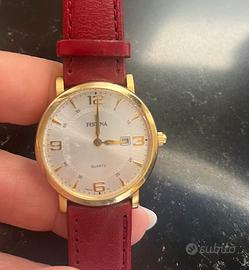 Festina unisex, movimento al quarzo, perfettamente funzionante, cassa oro, quadrante bianco, cinturino in pelle nuovo bordeaux