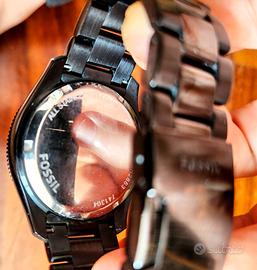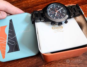 Cronografo Fossil 42mm, acciaio PVD nero con finiture opache e lucide alternate, ghiera lucida monodirezionale con scala 60 minuti. Impermeabile 100 metri, vetro zaffiro con trattamento anti riflesso e quadrante con leggibilità elevata.