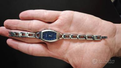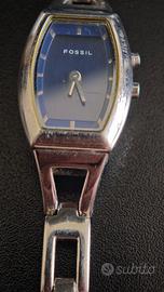 Vendo orologio Fossil originale da donna. L’orologio presenta una cassa a botte con un quadrante blu notte e un cinturino in acciaio. L'oggetto è usato e presenta evidenti segni di usura e graffi sulla cassa e sul vetro, come mostrato nelle foto, che ne testimoniano l'autenticità e il carattere vissuto.