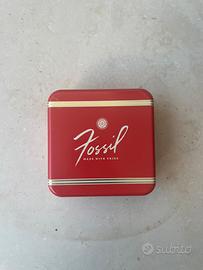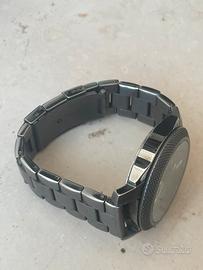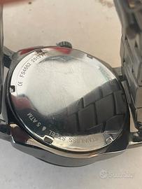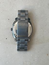 Bracciale grigio fumo con lancette in argento, resistente all'acqua fino a 50 m. Ottime condizioni con scatola rossa in alluminio.