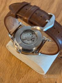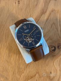 🧾 Descrizione: Orologio Fossil ME3110 automatico da uomo (linea Townsman). Movimento meccanico automatico con bilanciere a vista (open heart), quadrante blu con numeri romani, cassa in acciaio e fondello trasparente. Cinturino in vera pelle marrone. Stile elegante/classico con dettagli moderni, adatto a uso quotidiano e occasioni formali.