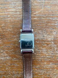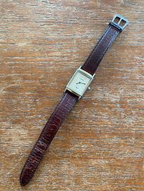 L'orologio mostrato nell'immagine è un modello vintage Fossil con cassa rettangolare (stile "tank") e movimento al quarzo. Questo design classico presenta un quadrante color crema/champagne con numeri arabi alle ore 3, 9 e 12, e un piccolo quadrante dei secondi a ore 6.