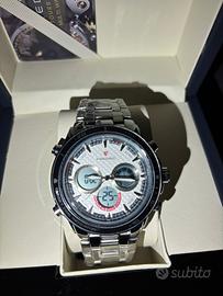 Quadrante: Multifunzione di colore bianco/argento con elementi neri e rossi, e un look da cronografo.