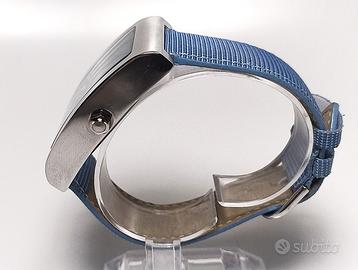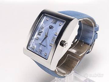 Orologio FS Phantom 1979 Mod 2788/018 vintage, funzionante, molto preciso, con bellissimo quadrante madreperlato di colore azzurro, con indici in caratteri romani. Cassa in metallo lucido. Cinturino in tessuto largo 24 mm lungo 23 cm. Misure cassa 35x45 mm spessore 12 mm. Bellissimo vetro bombato. Inizio anni 2000.