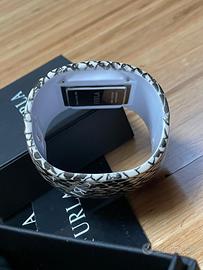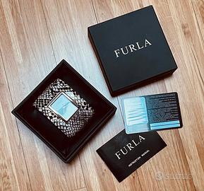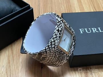 Orologio Furla con bracciale rigido in plastica colore fantasia pitone, forma ovale (larghezza interna per polso 5.5x6.5 cm). Fascia alta 5 cm. Orologio incastonato 2,5x3 cm quadrate bianco, bordo acciaio, meccanismo Quarzo. Si presenta con scatola Furla originale, garanzia e istruzioni per l'uso. Batteria ancora funzionante come NUOVO!!!