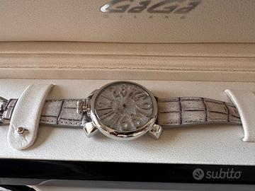 Gaga Milano orologio Lady cassa in acciaio,cinturino in pelle argentato quadrante in vetro zaffiro con brillantini, fibbia personalizzata. Spessore cassa 12.10 , dimensione mm 40.20. Come nuovo