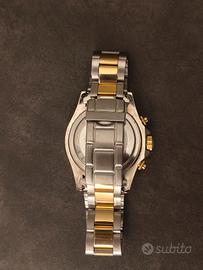Orologio cronografo Geneve dal forte carattere sportivo, con design bicolore acciaio/oro e quadrante nero in stile classico racing. Estetica ispirata ai cronografi iconici, con lunetta tachimetrica e contatori ben bilanciati. ✔ Movimento al quarzo ✔ Funzioni cronografo ✔ Cassa in acciaio con dettagli dorati ✔ Bracciale bicolore originale ✔ Ottima presenza al polso Orologio ideale per chi cerca un pezzo sportivo ed elegante allo stesso tempo. Condizioni buone come da foto, con normali segni d’uso. prezzo trattabile Scambio valutabile con Casio Seiko Citizen Orient Archs Bulova Pryngeps timex tissot vintage cronografo meccanico quarzo digitale o automatico anche da sistemare sempre vintage