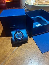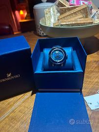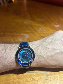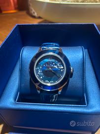 Elegantissimo orologio da donna Swarovski, modello con cassa rotonda in acciaio lucido e lunetta scintillante. Il quadrante è di un bellissimo blu profondo e cangiante, impreziosito da 9 cristalli Swarovski che rappresentano le fasi della luna, disposti in un cerchio elegante intorno al centro. Dettagli: • Cassa in acciaio con finitura oro rosa (rose gold) • Quadrante blu intenso con indici a cristalli Swarovski • Funzione fasi lunari con 9 lune • Vetro minerale resistente • Cinturino in pelle blu lucida di alta qualità, con chiusura a farfalla • Movimento al quarzo preciso e affidabile L’orologio è in condizioni praticamente nuove: indossato pochissime volte, nessun graffio visibile sulla cassa, sul vetro o sul cinturino. Conservato sempre nella sua bellissima scatola blu originale Swarovski (inclusa nella vendita). Perfetto per chi ama lo stile raffinato, femminile e luminoso. Un gioiello da polso che cattura la luce e gli sguardi. Prezzo: 150