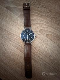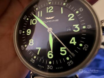 Vendo orologio originale Glycine automatico, in ottime condizioni. * Movimento automatico Glycine calibro GL224 (25 rubini) * Cassa in acciaio inox * Vetro zaffiro * Fondello a vista (trasparente) * Quadrante nero con numeri arabi e data * Lancette e indici luminescenti (visibili al buio) * Diametro circa 48 mm (senza corona) * Cinturino in pelle originale Glycine * Corona a cipolla (stile vintage) Orologio perfettamente funzionante, segni leggeri di utilizzo sulla cassa (visibili in foto). Spedizione disponibile con tracciamento. Possibile consegna a mano. Per ulteriori informazioni contattatemi.