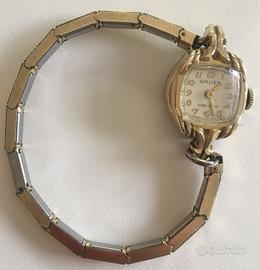 Oro 10 K G.F. (Gold Filled), carica manuale, bracciale espandibile, tutto perfettamente funzionante. Cassa in acciaio. Made in USA.