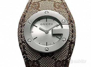 Vendo orologio con cassa tonda in acciaio e lunetta satinata modellata a forma di G, decorata con piccole viti. Cinturino a fascia in tessuto GG canvas beige, fibbia ad ardiglione in acciaio. Quadrante argentato, sfere a bastone sfaccettate per ore e minuti, logo Gucci alle ore 12, grandi indici applicati e piccoli indici stampati. Cristallo in zaffiro. Movimento al quarzo, impermeabilità 3 atmosfere.Solo segni di usura sotto al cinturino ma ancora possibile utilizzarlo no strappi no crepe.Vetro perfetto NO SPEDIZIONE!