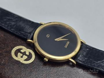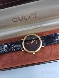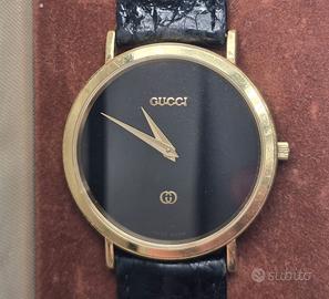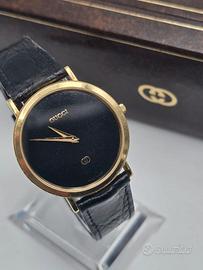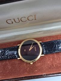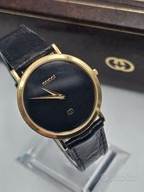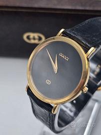 Splendido orologio Gucci originale con cassa in oro massiccio 18 carati, fibbia originale Gucci, cinturino in pelle di alligatore nero, diametro 34 mm, scatola originale.