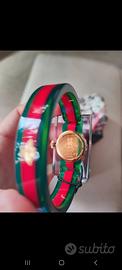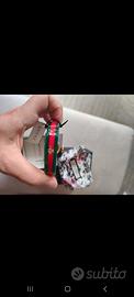 Cassa rettangolare in plexiglass trasparente con nastro verde - rosso - verde e movimento scheletrato a vista color oro giallo.
