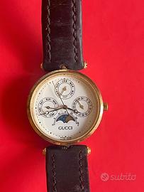 Orologio Gucci vintage, triplo calendario, giorno e mese, fasi lunari, placcato in oro 18 carati e acciaio inossidabile, al quarzo, orologio svizzero. Batteria da sostituire. Cinturino originale