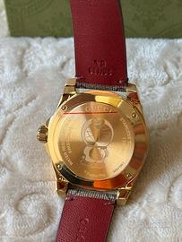 Gucci Dive Doraemon (Ref. YA136335). Modello unisex. Nuovo, mai indossato. Pellicole protettive di fabbrica ancora presenti su fondello e chiusura deployante. Specifiche tecniche: • Cassa: 40 mm, acciaio PVD oro • Movimento: Quarzo, Swiss Made • Cinturino: Tela GG Supreme e pelle bordeaux • Vetro: Zaffiro • Impermeabilità: 20 ATM Corredo (Full Set): • Scatola e controscatola Gucci • Libretto • Tag con seriale • Certificato di garanzia del rivenditore valida 1 anno dalla data del timbro. Atempora S.L. (datato 17/03/2026) Spedizione con imballaggio accurato.
