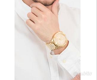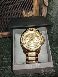 Orologio multifunzione da uomo di Guess. Modello con cassa del diametro di 48 mm in acciaio lucido con trattamento ip di colore oro impreziosita da cristalli e quadrante oro con pave' di cristalli. Orologio con bracciale acciaio lucido con trattamento ip di colore oro impreziosita da cristalli. La resistenza all'acqua è di 100 metri. La referenza è w0799g2