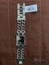 Orologio donna Guess in acciaio con quadrante rettangolare e swarovski, bracciale a doppia catena, nuovo con cartellino. Presenta pellicola protettiva sul quadrante e sul fondello. Completo di custodia originale a forma di sacchetto in pelle e cuore in acciaio.