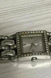 187. Vendo orologio GUESS elegante con cinturino argentato decorato da brillantini e quadrante rettangolare argentato, perfettamente funzionante. L’orologio presenta segni d’usura visibili e anche un brillantino mancante e la batteria è funzionante. Non dispongo della scatola originale. Caratteristiche: • Marca: GUESS • Colore quadrante: Argento • Materiale cinturino: Metallo argentato con brillantini • Condizione: Usato con segni visibili Un accessorio raffinato per completare il tuo look, perfetto per chi cerca un orologio di classe a un prezzo conveniente.