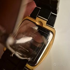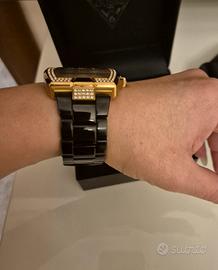 Orologio Guess in acciaio inossidabile di colore nero con cassa di colore oro rosa e contorno di swarovski.