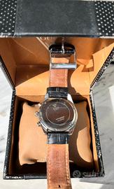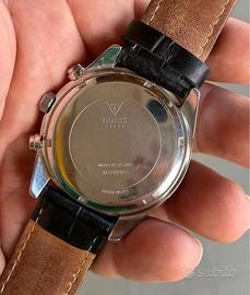 Il modello è il Guess W12004G1 Japan Movement. E’ un orologio cronografo da uomo della serie “Chase”. Presenta una cassa in acciaio inossidabile lucido di 40 mm di diametro e 12 mm di spessore, con un quadrante in smalto nero dotato di indici e lancette luminescenti, oltre a tre sub-quadranti per le funzioni cronografiche. La lunetta è in acciaio spazzolato e lucidato. Vetro antigraffio. Il cinturino è in pelle nera e chiusura ad ardiglione in acciaio. Il movimento è al quarzo, alimentato a batteria (nuova appena cambiata), e l’orologio offre una resistenza all’acqua fino a 30 m e 3 ATM. Usato molto raramente è un pari al nuovo. Vendo per inutilizzo. La confezione è un po’ rovinata ma l’orologio è perfetto e senza nessun graffio o difetto. Se avete bisogno di altre info o foto non esitate a chiedere.
