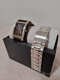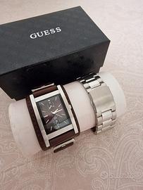 Orologio quadrato rettangolare Guess cioccolato con doppio cinturino, uno in vera pelle marrone ed uno in acciaio. Ottime condizioni, completo di scatola originale, no Swatch.