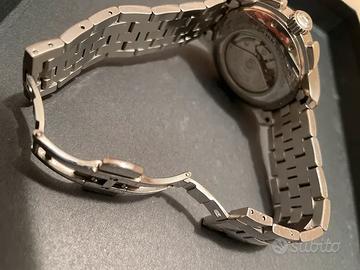 Cassa e cinturino in Acciaio inossidabile, Chiusura con pulsante a farfalla, cassa da 42 mm circa, fondello serrato con viti in vetro zaffiro trasparente, spessore della cassa 15 mm circa, Vetro zaffiro antigraffio, quadrante argentè.