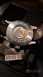 vendo hamilton automatico cassa 44mm, modello officier, scatola originale e referenza come in foto . tenuto perfettamente , 2 cinturini nato in pelle e originale in acciaio mi usato.