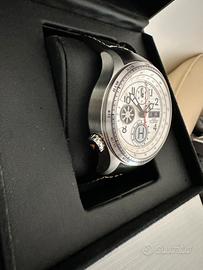 con cassa in acciaio inossidabile spazzolato, calcolatore del peso massimo al decollo (MTOW), cinturino in caucciù nero con cuciture bianche, fibbia ad ardiglione, vetro zaffiro, corona a vite, movimento cronografo automatico svizzero, calibro ETA 7750, riserva di carica di 42 ore, resistenza all'acqua fino a 10 ATM/ 100 m, dimensioni cassa 45,6 mm. Cinturino con qualche lieve segno di utilizzo.