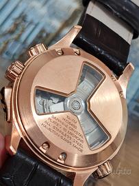 Orologio cronografo HAMILTON KHAKI X-COPTER referenza H766460 SWISS MADE, USATO POCHISSIMO, in ottime condizioni, con cinturino pari al nuovo in pelle marrone e cuciture bianche con chiusura a fibbia ardiglione. Movimento cronografo automatico svizzero, calibro ETA Valjoux 7750, riserva di carica di 42 ore. La cassa è in acciaio inossidabile placcata oro rosa di ben 10 microns (generalmente la placcatura è di soltanto 2-3 microns). Il quadrante è analogico di colore nero con vetro zaffiro antigraffio e lancette a freccia appuntite luminescenti e indici delle ore con numeri arabi, a ore 3 presenta il display del giorno della settimana e della data; ha inoltre tre quadranti secondari ad ore 12 quello di 30 minuti ad ore 6 quello di 12 ore ed a ore 9 quello di 60 secondi che gira a forma di elica. L'orologio è ispirato al cruscotto degli elicotteri, la lunetta esterna è fissa placcata ionica nera e presenta una bussola , sulla lunetta interna c'è un convertitore di temperatura Celsius-Fahrenheit, ad ore 6 nel mezzo del quadrante delle 12 ore c'è una grande H che contrassegna un “helipad” ossia una piattaforma di atterraggio per elicotteri ed a ore 9 è posizionato l'indicatore MTOW (Maximum Take Off Weight) ossia il calcolatore del peso massimo al decollo, adatto per l'uso in elicottero. Sulla destra della cassa si trovano, centralmente la corona a vite , in alto un pulsante a forma di corona che aziona la partenza del cronografo, in basso un altro pulsante che azzera i valori del cronografo. Sulla sinistra della cassa si trova una corona a vite ausiliaria che ruota e regola l'indicatore MTOW (sopra spiegato). L'orologio è impermeabile fino a 10 ATM / 100 metri (330 piedi). Il fondello (retro cassa) è scheletrato a forma di elica e mostra l'interno del movimento.