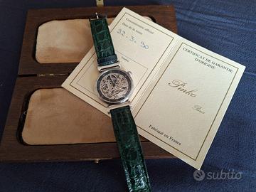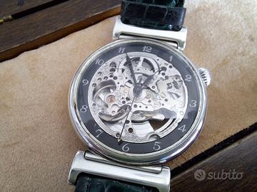 Vendo particolare orologio dell'arte orologiera svizzera Hebdomas Pinko anni 90 Skeleton ref. 3201 cassa argento 925 massiccio, vetro frontale esalit, posteriore vetro minerale, mov. OLD A. SCHILD a carica automatica modificata, Diam. 38,5 mm H. 11,2 mm, cinturino in coccodrillo, scatola di legno.