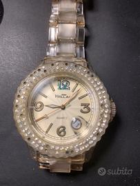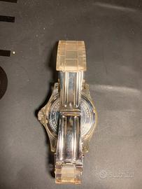 Orologio HELLAS cinturino plastica trasparente, cassa in acciaio. Movimento al quarzo. Non funzionante.