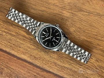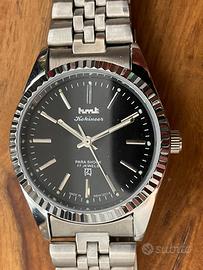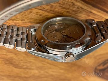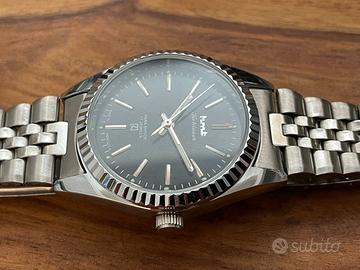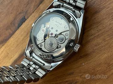 Vendo raro orologio HMT Kohinoor, un classico dell'orologeria meccanica indiana, Made in India. Perfetto come segnatempo per tutti i giorni, orologio robusto e affidabile. Movimento meccanico a carica manuale Parashock (17 Jewels), affidabile e preciso. Ottime condizioni estetiche, come da foto. Vetro pulito e cassa in acciaio ben conservata. L'orologio è stato recentemente revisionato; marcia regolarmente e tiene bene il tempo. Durata della carica circa 10 ore. Bellissimo quadrante nero con indici a bastone, lunetta scanalata fissa e bracciale modello "Jubilee" originale in acciaio. Fondello trasparente con visibile il movimento. L'orologio è pronto per essere indossato e non necessita di alcun intervento. Un pezzo perfetto per chi cerca un segnatempo vintage elegante e funzionale a un prezzo accessibile. Invito a visionare i miei altri annunci con automatici HMT vintage e altri. Posso spedire con servizio TuttoSubito ma preferirei scambio a mano in zona Milano e provincia, dopo attenta verifica.