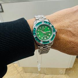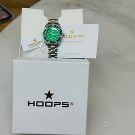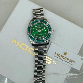 Elegante orologio Hoops con un vivace quadrante verde e un cinturino in acciaio.Cassa in acciaio.Lunetta decorata con pietre verdi.Chiusura deployante.