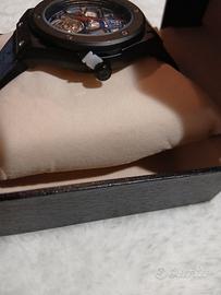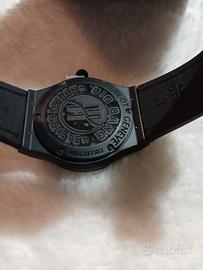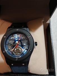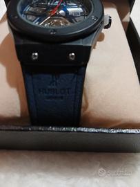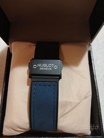 Elegante orologio Hublot con cinturino in tessuto. - Cassa nera. - Dettagli blu sul quadrante. - Cinturino in tessuto blu.