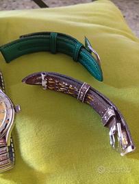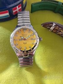 In vendita splendido orologio Immersion Line Breeze, brand storico Stendardo, noto per il suo legame con il mondo della subacquea e le imprese di Enzo Maiorca. L'articolo è un fondo di magazzino (NOS - New Old Stock): non è mai stato indossato ed è ancora completo della sua scatola metallica originale blu con grafica marina. Caratteristiche principali: Quadrante: Giallo vibrante con datario Day-Date. Cassa: Acciaio inossidabile. Condizioni: Orologio nuovo, mai usato. Nota bene: i cinturini originali (incluso quello in pelle marrone e quello verde) presentano delle screpolature dovute esclusivamente al passare del tempo e alla conservazione prolungata. Extra: Inclusa confezione originale in latta a tema "Immersion". Perfetto per collezionisti di orologi subacquei vintage o per chi cerca un pezzo dallo stile sportivo anni '90 da personalizzare con un nuovo cinturino. Prezzo: 35€ Spedizione: Disponibile o ritiro a mano in zona Torino